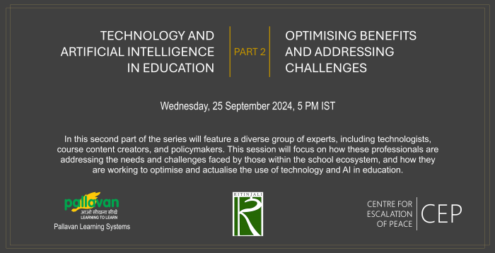 On September 25th, 2024, Pallavan Learning Systems hosted its 16th webinar on the theme, “Technology and AI in Education Part 2: Optimising Benefits and Addressing Challenges’' in association with Ritinjali and Centre for Escalation of Peace.