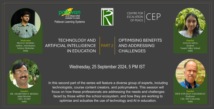 On September 25th, 2024, Pallavan Learning Systems hosted its 16th webinar on the theme, “Technology and AI in Education Part 2: Optimising Benefits and Addressing Challenges’' in association with Ritinjali and Centre for Escalation of Peace.