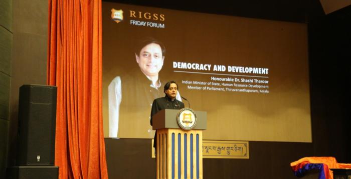 Dr. Shashi Tharoor, Minister of State for Human Resource Development, India addressed the Friday Forum at the Royal Institute for Governance and Strategic Studies (RIGSS) in Phuentsholing on 1 November 2013. The Friday Forum is a weekly programme at the Institute where various speakers come and speak on relevant issues. Dr. Tharoor’s visit was facilitated by The Thimphu Seminars and Mr. Arun Kapur, Chairman of The Thimphu Seminars, accompanied Dr. Tharoor to Phuentsholing.